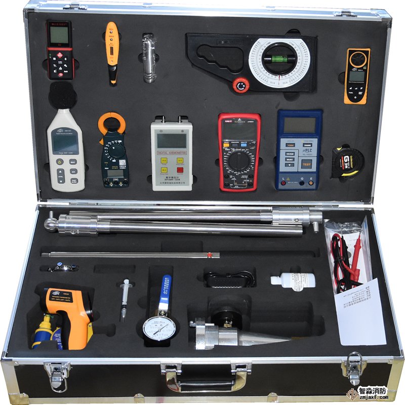 配置:感烟探测器试验装置;感温探测器试验装置;水喷淋系统试水检测装置;消火栓系统试水检测装置;数字兆欧表;数字噪音计;数字微压计;数字测距仪;红外测温仪;垂直度测定仪;多功能工程坡度测定仪;四合一测量仪(温度、湿度、风速、照度);钳形电流表;数字万用表;数字秒表;附件:数字试电笔、钢卷尺、打火机、加热笔附件盒、发烟棒盒、烟嘴、充电器、丁烷气瓶、仪表测试笔、、多功能刀。
