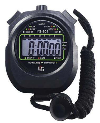 秒表主要有机械秒表和电子表等2类,电子秒表主要为三按键和四按键2大类。现在,使用最为广泛的是电子秒表,机械秒表使用已很少见。目前,国产电子秒表一般是利用石英振荡器的振荡频率作为时间基准,采用6位液晶数字显示时间,具有显示直观、读取方便、功能多等优点,如图1-1所示。