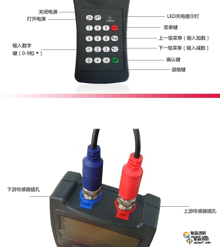 先将传感器与主机相接,红色传感器接于上游端子,蓝色传感器放于下游端子。然后将两个磁性传感器与所测流量的管道连接,若不能相吸引,则采用支架将传感器固定。固定好后打开主机输入管道材质、直径、传感器距离,流体性质等相应的参数,即可开始测量。