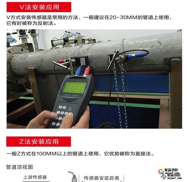 超声波流量计的传感器一般采用V方式和Z方式安装,通常情况下,管径小于300mm时,采用V方式安装,管径大于200mm时,采用Z方式安装。对于即可以用V方式安装又可以Z方式安装的传感器,尽量选用Z方式。实践表明,Z方式安装的传感器超声波信号强度高,测量的稳定性也好,图2。