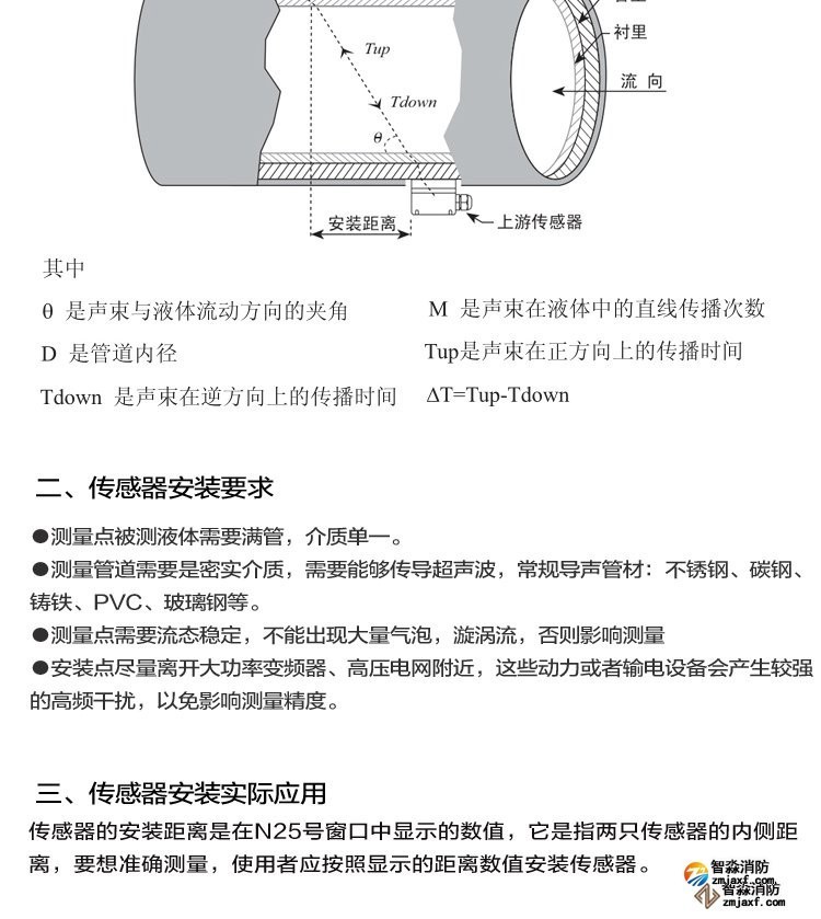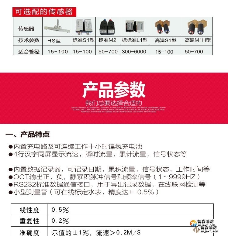 超声波流量计测量管径范围:15mm~300mm,精度: